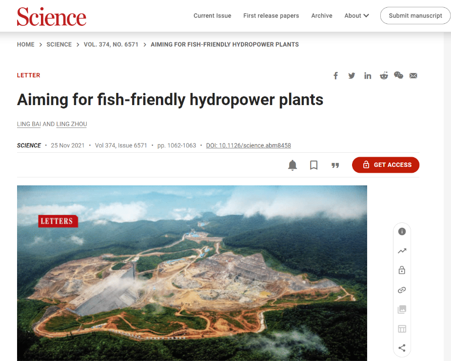 On Nov. 25, a young teacher of our university published a Letter paper entitled ‘Aiming for fish-friendly hydropower plants’ in Science journal. (Vol 374, Issue 6571, DOI: 10.1126/science.abm8458) Jiangsu University is the only author affiliation of this article, and researcher Zhou Ling of our fluid center is the corresponding author.