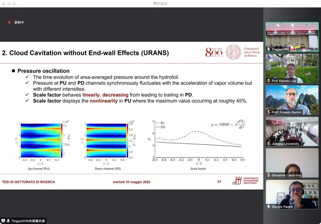 At the defense meeting, Yin Tingyun gave a report on his doctoral dissertation “Numerical Analyses on Unsteady Cavitating Flow”. Meanwhile, he answered questions raised by experts of the Defense Committee on the research work. The Defense Committee gave a high appraisal of his work, and consented to grant him double doctorate of UNIPD and JSU. This doctoral dissertation has made critical achievements in flow mechanism, instability characteristics and potential suppression methods related to unsteady cavitation. He has published academic papers in important international journals in this field, such as Ocean Engineering, International Journal of Multiphase Flow, ASME Journal of Fluids Engineering and Journal of Fluids and Structures. The Defense Committee unanimously agreed to give this doctoral dissertation the honor of “Cum Laude”.