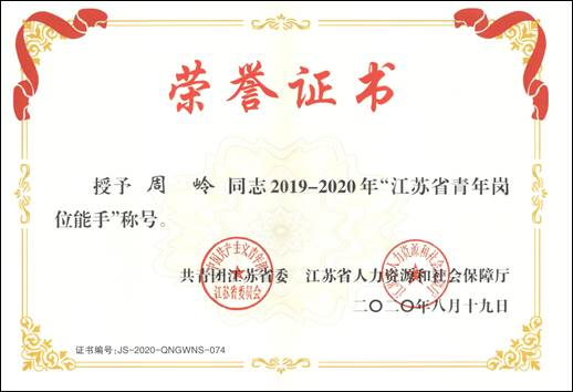 近日,共青团江苏省委、人社厅公布了“2019-2020年江苏省(杰出)青年岗位能手”入选名单,经过广泛申报、审核初评、集中答辩、送审确认、公示复核等程序,共遴选出10名江苏省杰出青年岗位能手、94名江苏省青年岗位能手,其中高校系统仅有4人入选。游戏赌博 在线游戏赌博平台推荐 周岭副研究员荣获“江苏省青年岗位能手”荣誉称号。